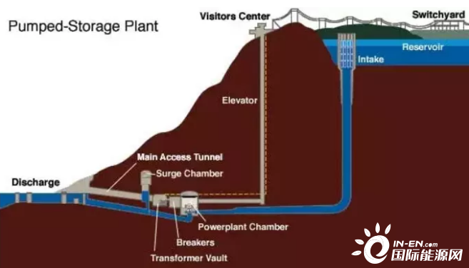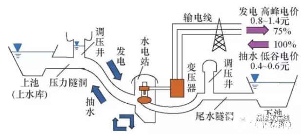 電網(wǎng)低谷時(shí)利用過(guò)剩電力將作為液態(tài)能量媒體的水從低標(biāo)高的水庫(kù)抽到高標(biāo)高的水庫(kù),電網(wǎng)峰荷時(shí)高標(biāo)高水庫(kù)中的水回流到下水庫(kù)推動(dòng)水輪機(jī)發(fā)電機(jī)發(fā)電。