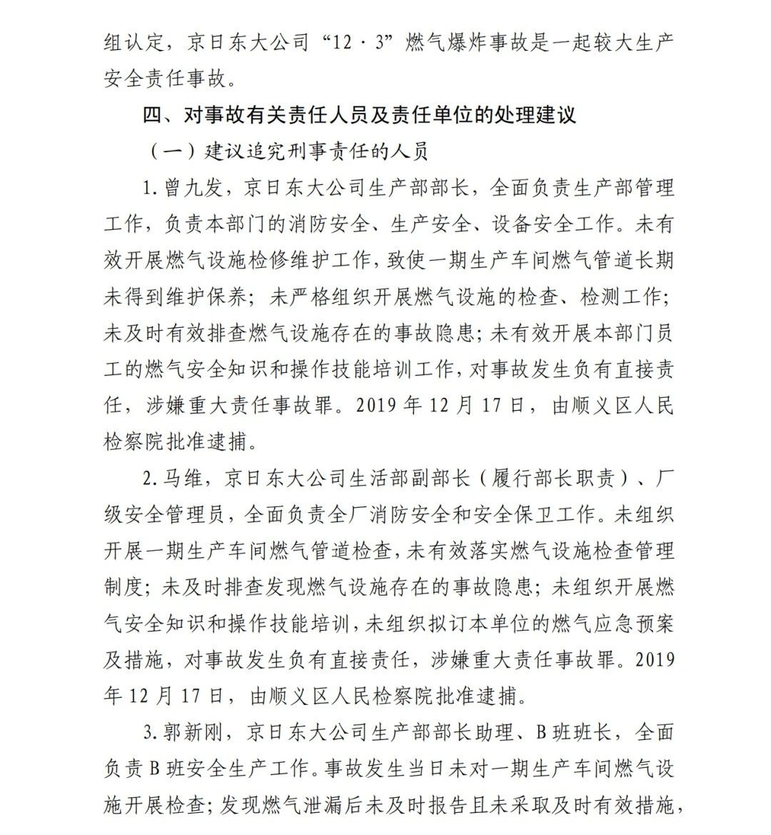 1.曾九發(fā),京日東大公司生產(chǎn)部部長,全面負(fù)責(zé)生產(chǎn)部管理工作,負(fù)責(zé)本部門的消防安全、生產(chǎn)安全、設(shè)備安全工作。未有效開展燃?xì)庠O(shè)施檢修維護(hù)工作,致使一期生產(chǎn)車間燃?xì)夤艿篱L期未得到維護(hù)保養(yǎng);未嚴(yán)格組織開展燃?xì)庠O(shè)施的檢查、檢測工作;未及時有效排查燃?xì)庠O(shè)施存在的事故隱患;未有效開展本部門員工的燃?xì)獍踩R和操作技能培訓(xùn)工作,對事故發(fā)生負(fù)有直接責(zé)任,涉嫌重大責(zé)任事故罪。2019 年 12 月 17 日,由順義區(qū)人民 檢察院批準(zhǔn)逮捕。