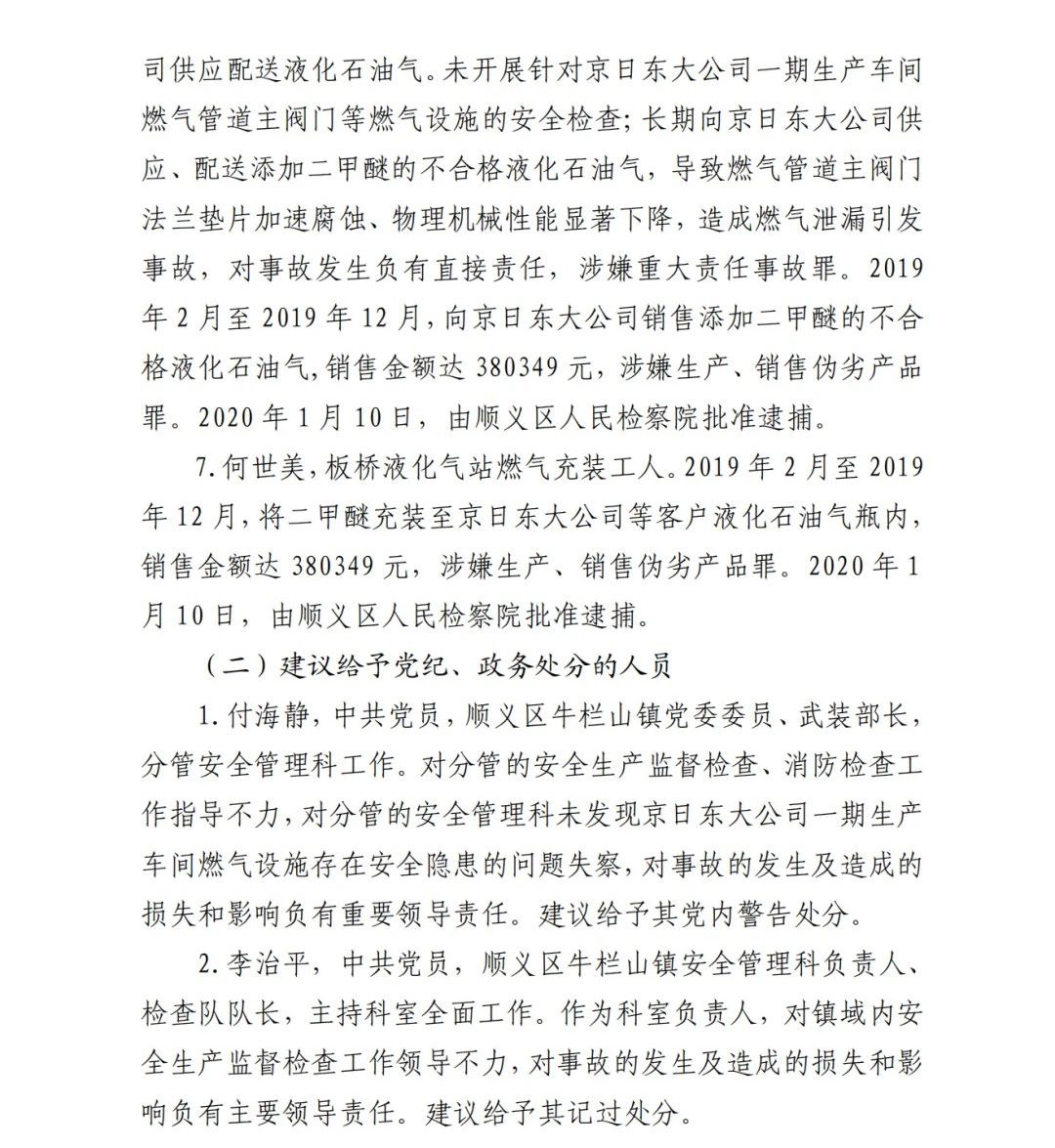 6.吳建新,板橋液化氣站工作人員,具體負(fù)責(zé)向京日東大公15司供應(yīng)配送液化石油氣。未開展針對京日東大公司一期生產(chǎn)車間燃?xì)夤艿乐鏖y門等燃?xì)庠O(shè)施的安全檢查;長期向京日東大公司供應(yīng)、配送添加二甲醚的不合格液化石油氣,導(dǎo)致燃?xì)夤艿乐鏖y門法蘭墊片加速腐蝕、物理機(jī)械性能顯著下降,造成燃?xì)庑孤┮l(fā) 事故,對事故發(fā)生負(fù)有直接責(zé)任,涉嫌重大責(zé)任事故罪。2019 年 2 月至 2019 年 12 月,向京日東大公司銷售添加二甲醚的不合 格液化石油氣,銷售金額達(dá) 380349 元,涉嫌生產(chǎn)、銷售偽劣產(chǎn)品 罪。2020 年 1 月 10 日,由順義區(qū)人民檢察院批準(zhǔn)逮捕。