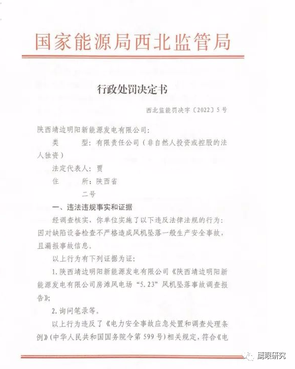 3月18日,國家能源局西北監(jiān)管局發(fā)布對陜西靖邊明陽新能源發(fā)電有限公司的行政處罰決定書(西北監(jiān)能罰決字〔2022〕5號),該公司因?qū)θ毕菰O(shè)備檢查不嚴(yán)格造成風(fēng)機墜落一般生產(chǎn)安全事故,且漏報事故信息,對其作出罰款10萬元的決定。