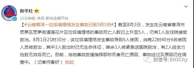 【#云南普洱一垃圾填埋場(chǎng)發(fā)生事故已致5死1傷#】截至8月3日,發(fā)生在云南省普洱市思茅區(qū)思茅街道蓮花片區(qū)垃圾填埋場(chǎng)的事故死亡人數(shù)已上升至5人,仍有1人在住院接受救治。8月1日21時(shí)30分,該垃圾填埋場(chǎng)發(fā)生事故導(dǎo)致6人被困,當(dāng)晚22時(shí)40分6名被困人員被救出,其中3人救出時(shí)已無(wú)生命體征,其余3人被緊急送醫(yī)院救治,有2人經(jīng)全力搶救無(wú)效后死亡。目前,當(dāng)?shù)厥鹿示仍笓]部稱死者死亡原因、事故經(jīng)過(guò)及原因仍在調(diào)查中。(記者何春好)極目新聞?dòng)浾呤崂戆l(fā)現(xiàn),普洱市中心城區(qū)生活垃圾焚燒發(fā)電廠建設(shè)項(xiàng)目,為思茅區(qū)2019年23項(xiàng)重點(diǎn)工作之一,于2019年啟動(dòng)建設(shè),并優(yōu)先完成填埋區(qū)建設(shè)。2020年,普洱市相關(guān)領(lǐng)導(dǎo)曾前往思茅區(qū),實(shí)地調(diào)研市中心城區(qū)生活垃圾焚燒發(fā)電廠項(xiàng)目推進(jìn)工作。公開資料顯示,2020年3月,配套填埋場(chǎng)正式投入使用,填埋場(chǎng)類型為填埋生活垃圾的衛(wèi)生填埋場(chǎng),庫(kù)容為30.1萬(wàn)立方。