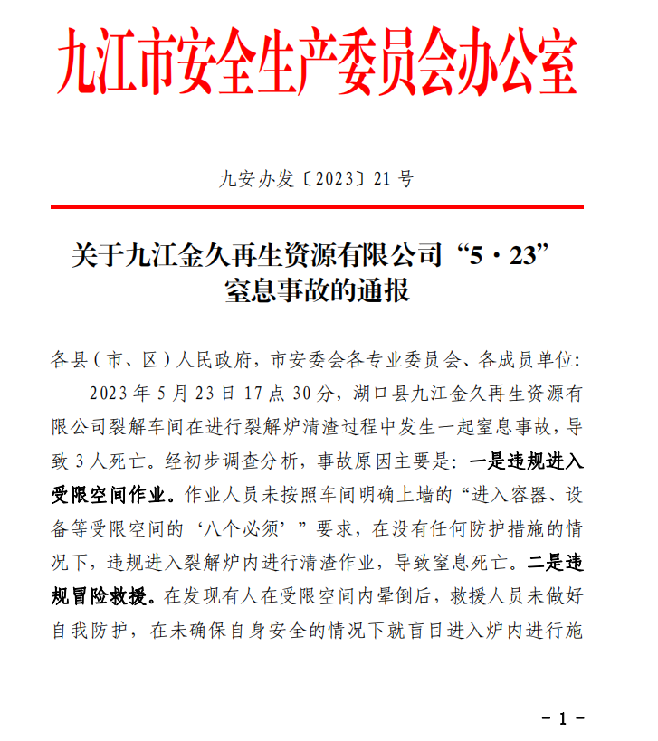 2023年5月23日17點(diǎn)30分,湖口縣九江金久再生資源有限公司裂解車間在進(jìn)行裂解爐清渣過(guò)程中發(fā)生一起