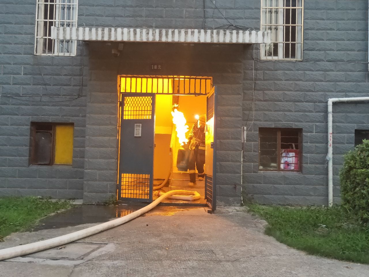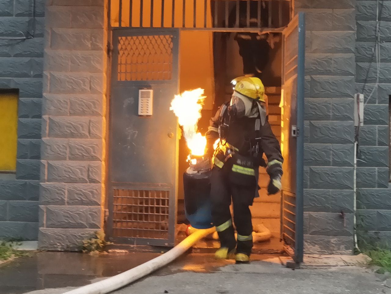 到達現(xiàn)場消防指戰(zhàn)員發(fā)現(xiàn),著火處物為煤氣罐,該煤氣罐位于居民房內(nèi)廚房里,處于猛烈燃燒階段,隨時都有爆炸的可能,而且居民樓樓下都住有居民,一旦發(fā)生爆炸,后果不堪設(shè)想。