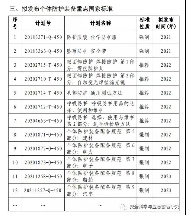 一、總體要求 深入學(xué)習(xí)貫徹習(xí)近平總書記“把人民群眾生命安全和身體健康放在第一位”的重要指示精神,落實(shí)《國家標(biāo)準(zhǔn)化發(fā)展綱要》,實(shí)施公共安全標(biāo)準(zhǔn)化筑底工程,堅(jiān)持人民至上、生命至上,聚焦重點(diǎn)行業(yè)、重點(diǎn)產(chǎn)品,加大標(biāo)準(zhǔn)研制工作進(jìn)度,充分發(fā)揮標(biāo)準(zhǔn)引領(lǐng)帶動作用,推動個體防護(hù)裝備質(zhì)量與安全水平持續(xù)提升,推動生產(chǎn)經(jīng)營單位嚴(yán)格按照國家標(biāo)準(zhǔn)要求配備個體防護(hù)裝備,為維護(hù)勞動者安全健康權(quán)益提供更加有力支撐。 到2023年底,個體防護(hù)裝備標(biāo)準(zhǔn)體系進(jìn)一步完善,重點(diǎn)個體防護(hù)裝備產(chǎn)品標(biāo)準(zhǔn)水平持續(xù)提升,主要性能指標(biāo)與國際、國外發(fā)達(dá)國家保持基本一致,個體防護(hù)裝備國際標(biāo)準(zhǔn)取得重點(diǎn)突破。推出一批重點(diǎn)行業(yè)個體防護(hù)裝備配備標(biāo)準(zhǔn),配備標(biāo)準(zhǔn)對生產(chǎn)經(jīng)營單位個體防護(hù)裝備的規(guī)范作用初步顯現(xiàn)。重點(diǎn)個體防護(hù)裝備質(zhì)量監(jiān)督抽查,重點(diǎn)行業(yè)、領(lǐng)域個體防護(hù)裝備配備的執(zhí)法檢查得到有效開展,個體防護(hù)裝備標(biāo)準(zhǔn)管理、產(chǎn)品生產(chǎn)、檢驗(yàn)檢測、配備使用及實(shí)施反饋的閉環(huán)機(jī)制基本形成。個體防護(hù)裝備標(biāo)準(zhǔn)化助力行業(yè)高質(zhì)量發(fā)展,保障勞動者生命安全和身體健康的作用進(jìn)一步凸顯。 二、重點(diǎn)任務(wù) (一)集中發(fā)布實(shí)施一批個體防護(hù)裝備國家標(biāo)準(zhǔn)。 加大個體防護(hù)裝備領(lǐng)域國家標(biāo)準(zhǔn)的有效供給,逐步建立健全個體防護(hù)裝備標(biāo)準(zhǔn)體系。在已有石化、冶金、有色、礦山等領(lǐng)域個體防護(hù)配備標(biāo)準(zhǔn)的基礎(chǔ)上再重點(diǎn)選取建材、電子、電力等急需短缺行業(yè)、領(lǐng)域,從個體防護(hù)裝備的配備原則、配備程序、配備基本要求、判廢和更換、培訓(xùn)和使用等方面,制定發(fā)布一批個體防護(hù)裝備配備強(qiáng)制性國家標(biāo)準(zhǔn),為高危行業(yè)從業(yè)人員的個體防護(hù)裝備配備管理提供執(zhí)法和監(jiān)管依據(jù)。對標(biāo)國際先進(jìn)標(biāo)準(zhǔn),集中推出一批個體防護(hù)裝備產(chǎn)品和檢測相關(guān)推薦性國家標(biāo)準(zhǔn),以標(biāo)準(zhǔn)引領(lǐng)我國個體防護(hù)相關(guān)產(chǎn)品質(zhì)量安全水平持續(xù)提升。在呼吸防護(hù)、防護(hù)服裝等領(lǐng)域,牽頭提出國際標(biāo)準(zhǔn)項(xiàng)目提案,推動我國個體防護(hù)裝備國際標(biāo)準(zhǔn)取得新突破。 (二)深入開展標(biāo)準(zhǔn)宣傳和培訓(xùn)。 采取集中宣貫為主,培訓(xùn)、調(diào)研為輔的形式,組織全國個體防護(hù)裝備標(biāo)準(zhǔn)化技術(shù)委員會等相關(guān)單位,面向生產(chǎn)企業(yè)、檢測機(jī)構(gòu)和生產(chǎn)經(jīng)營單位進(jìn)行全方位、多層次、有針對性的宣貫培訓(xùn),按年度制定并發(fā)布標(biāo)準(zhǔn)宣貫計(jì)劃。引導(dǎo)廣大生產(chǎn)企業(yè)“學(xué)標(biāo)、用標(biāo)、對標(biāo)”,加快企業(yè)技術(shù)更新,推動產(chǎn)品升級換代。開展“個體防護(hù)裝備標(biāo)準(zhǔn)進(jìn)基層,筑牢最后一道防線”系列活動,推動生產(chǎn)經(jīng)營單位按需求購買、按標(biāo)準(zhǔn)配備、按工種佩戴。 (三)強(qiáng)化個體防護(hù)裝備質(zhì)量安全監(jiān)管。 統(tǒng)籌做好生產(chǎn)和流通領(lǐng)域個體防護(hù)裝備的質(zhì)量監(jiān)督抽查,以問題為導(dǎo)向,突出抽查重點(diǎn)產(chǎn)品和重點(diǎn)領(lǐng)域,繼續(xù)加大非醫(yī)用口罩等防護(hù)裝備,以及安全網(wǎng)、安全帽等與安全生產(chǎn)密切相關(guān)的防護(hù)裝備的監(jiān)督抽查力度。力爭用3年時間,清理一批違法違規(guī)生產(chǎn)銷售產(chǎn)品,查處一批違法大案要案,解決一批質(zhì)量安全突出問題,全面提升個體防護(hù)裝備質(zhì)量水平。 (四)加強(qiáng)個體防護(hù)裝備產(chǎn)品的認(rèn)證認(rèn)可有效供給。 建立適合個體防護(hù)裝備及相關(guān)領(lǐng)域的質(zhì)量認(rèn)證制度體系,促進(jìn)新技術(shù)、新產(chǎn)品、新業(yè)態(tài)的成熟應(yīng)用。在個體防護(hù)裝備領(lǐng)域支持一批技術(shù)有特長、服務(wù)有特色的專業(yè)檢驗(yàn)檢測認(rèn)證機(jī)構(gòu)發(fā)展,不斷滿足市場多樣化、個性化需求。加強(qiáng)能力驗(yàn)證制度在個體防護(hù)裝備檢測領(lǐng)域的應(yīng)用,幫助相關(guān)檢驗(yàn)檢測機(jī)構(gòu)提升技術(shù)能力和人員水平。對標(biāo)國際,促進(jìn)個體防護(hù)裝備產(chǎn)品領(lǐng)域合格評定結(jié)果的互認(rèn),推動相關(guān)企業(yè)和產(chǎn)品“走出去”。 (五)加強(qiáng)個體防護(hù)裝備配備的執(zhí)法檢查。 結(jié)合新《安全生產(chǎn)法》和個體防護(hù)裝備配備強(qiáng)制性國家標(biāo)準(zhǔn)的實(shí)施,加大對高危行業(yè)、領(lǐng)域使用個體防護(hù)裝備的執(zhí)法檢查力度,堅(jiān)決守住勞動者安全防護(hù)底線。將個體防護(hù)裝備配備強(qiáng)制性國家